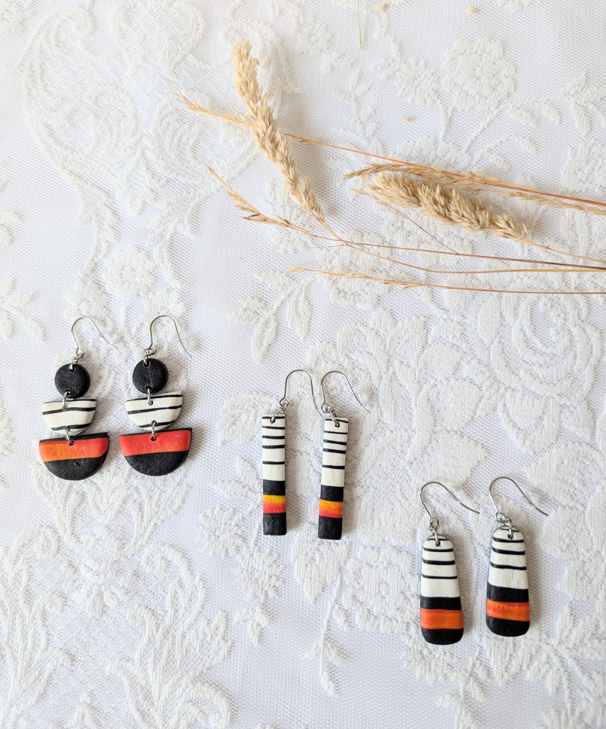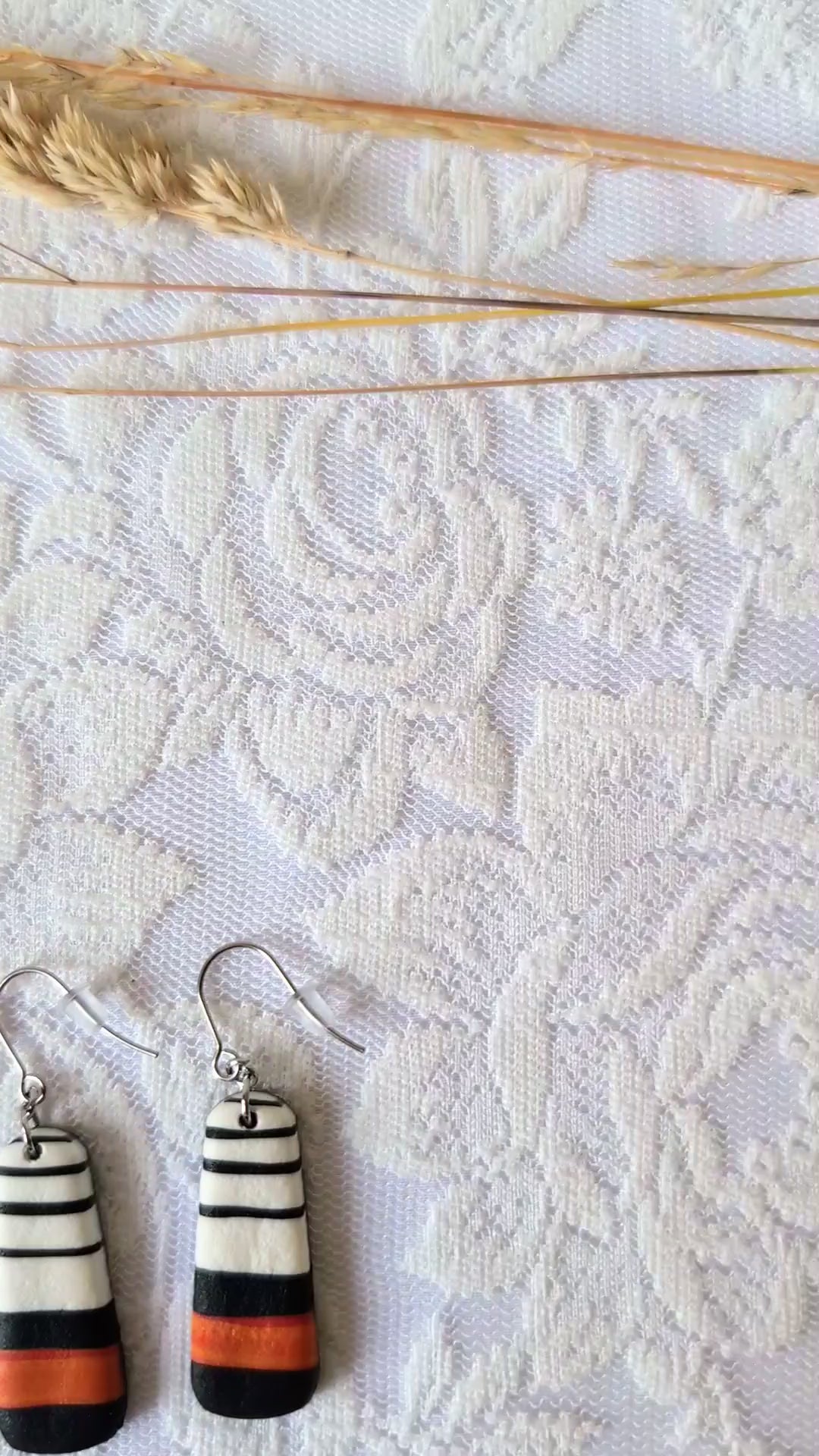 "Expertly handcrafted using high-quality polymer clay, these earrings feature a unique design incorporating white, orange, and black colors. The lightweight materials provide all-day comfort, making them the perfect addition to any outfit. Elevate your style with these one-of-a-kind handmade earrings."