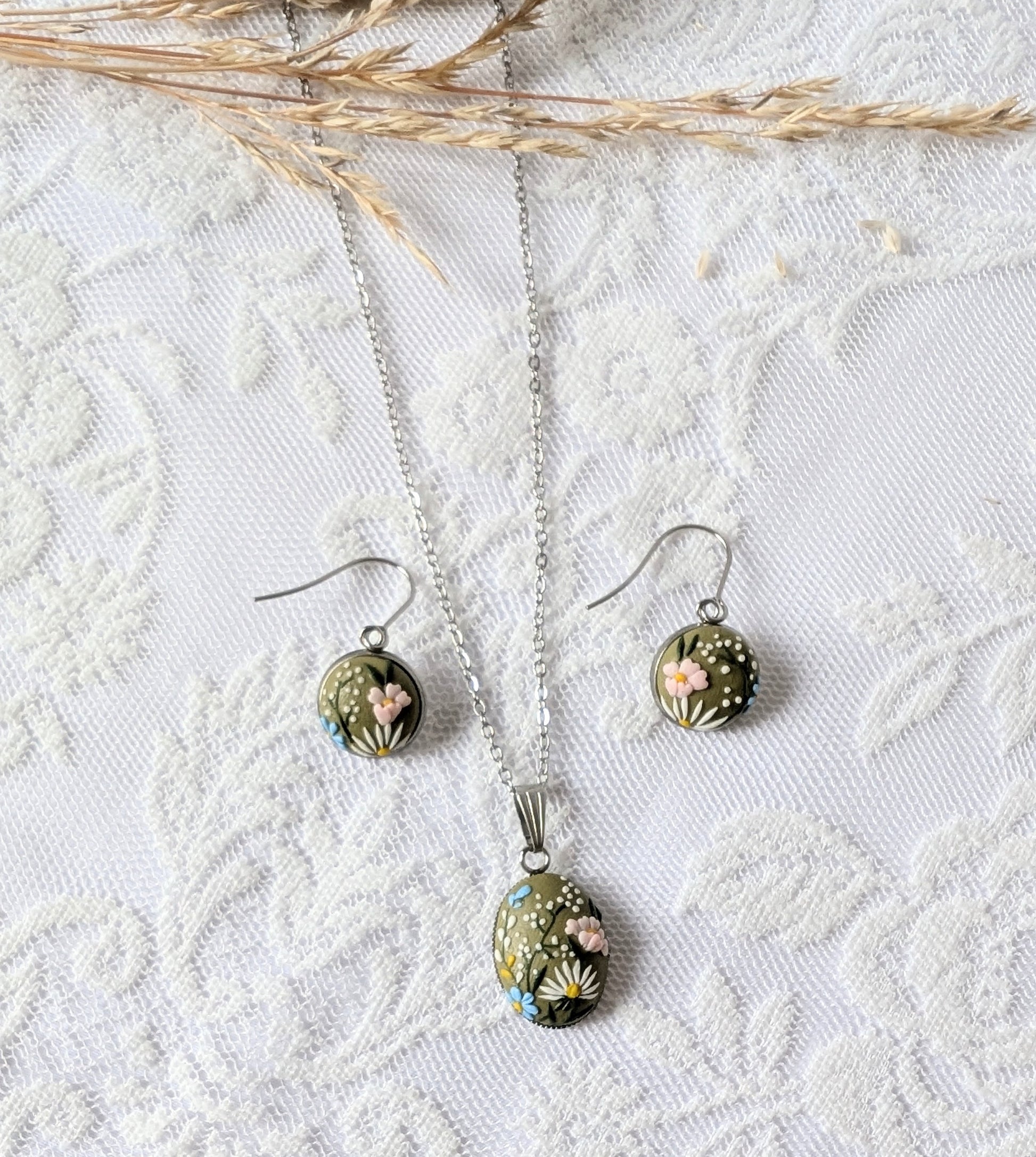 This oval pendant and earrings features a miniature landscape of delicate white daisies and soft pink blossoms, nestled amongst lush green foliage on an earthy olive background. Crafted with meticulous attention to detail, this unique set captures the beauty of nature's artistry.